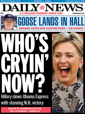 Daily News In a night packed with high political drama, Hillary Clinton defied expectations of a humiliating rout and triumphed in the New Hampshire primary Tuesday, reviving her hopes of returning to the White House. So what happened? Apparently, tears work. Clinton's stunning poll reversal was fueled by women, who spurned her in Iowa, but gave her a big margin in New Hampshire. Many of them decided on the last day. | ![]() | |